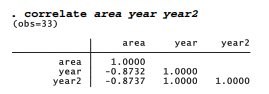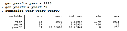 We accomplish centering by subtracting the mean from one x variable before calculating the second. The mean year in these data is 1995; a centered version here called year0 represents years before 1995 (negative) or after 1995 (positive). Centered year0 has a mean of 0. A second new variable, year02, equals year0 squared. Its values range from 256 (when year0 = -16, meaning 1979) to 0 (when year0 = 0, meaning 1995), and then back up to 256 (when year0 = +16, meaning 2011).