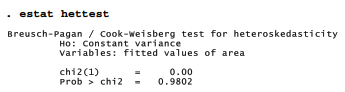The estat command obtains other useful diagnostic statistics as well. For example, estat hettest performs a heteroskedasticity test for the assumption of constant error variance. It does this by examining whether squared standardized residuals are linearly related to predicted values (see Cook and Weisberg 1994 for discussion and example). As seen below, estat hettest here gives no reason to reject the null hypothesis of constant variance. That is, we see no significant heteroskedasticity.