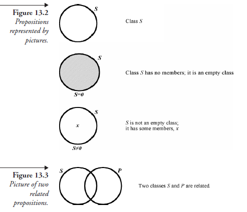 Propositions otherwise expressed in words can also be picturized, using circles to represent classes; some of the symbolic representations in traditional logic and their literal meanings are shown in Figure 13.2.