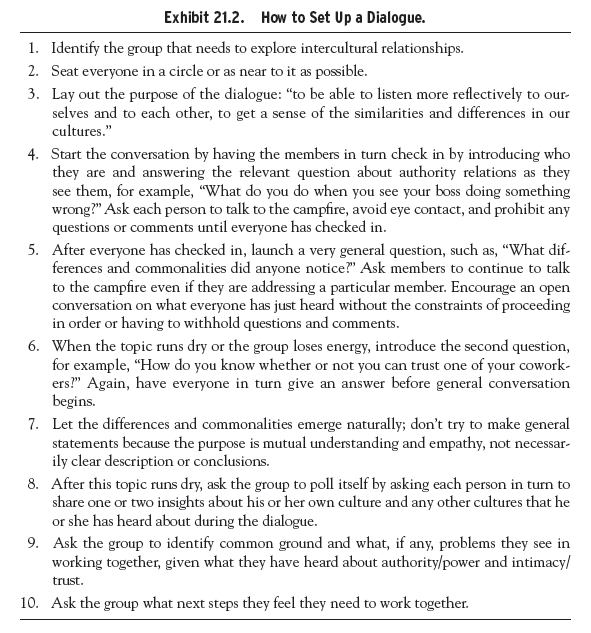 The case example involved students in a learning situation. How a comparable process would be set up in a multicultural task force or a surgical team depends very much on the actual situation and the goals that the leader is trying to accomplish. Ideally the group will have already decided to move physically out of the work setting to make the creation of the cultural island atmosphere easier. However, the dialogue format can create the cultural island atmosphere on its own if the ground rules are followed. In fact, the power of the dialogue format is that it stimulates the cultural island norms through its process even if it is done in a work setting. Exhibit 21.2 lays out the process if you desire to run your own dialogue session.