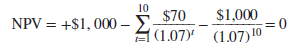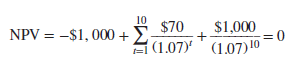 NPV =-$1,000 + PV of interest payments at 7% of $1,000 + PV of principal ($1,000 repaid in year 10)