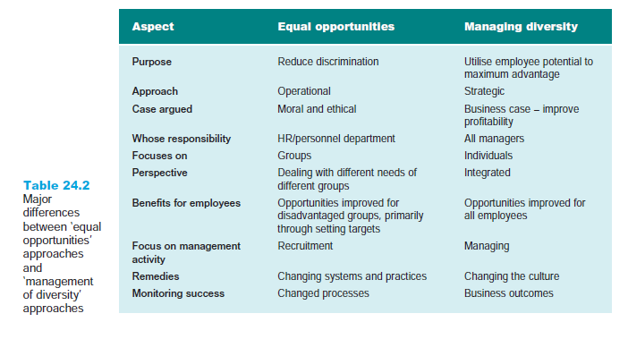 Table 24.2 summarises the key differences between equal opportunities and managing diversity.