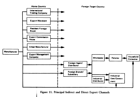 It is reasonable to regard the marketing channel in a foreign target country as an extension of a direct export channel. Accordingly, we define a direct export channel as the chain of marketing agencies that links a domestic manufacturing company to the final buyers (or users) of its product in the foreign target market. These agencies negotiate sales transactions, direct the physical movement and storage of the product, and provide other services in order to place the product ultimately in the ownership and possession of final buyers where, when, and in the quantities they want it. The foreign agencies participating in a direct export channel may be independent middlemen or owned by the manufacturer; they may be many or few in number. Since the first and last links in the direct export channel are the manufacturer and final buyers, respectively, it is logical to consider them also as channel elements. It is important for manufacturers to con-ceive the export channel as the full marketing channel rather than as a channel that stops with the foreign distributor or agent.