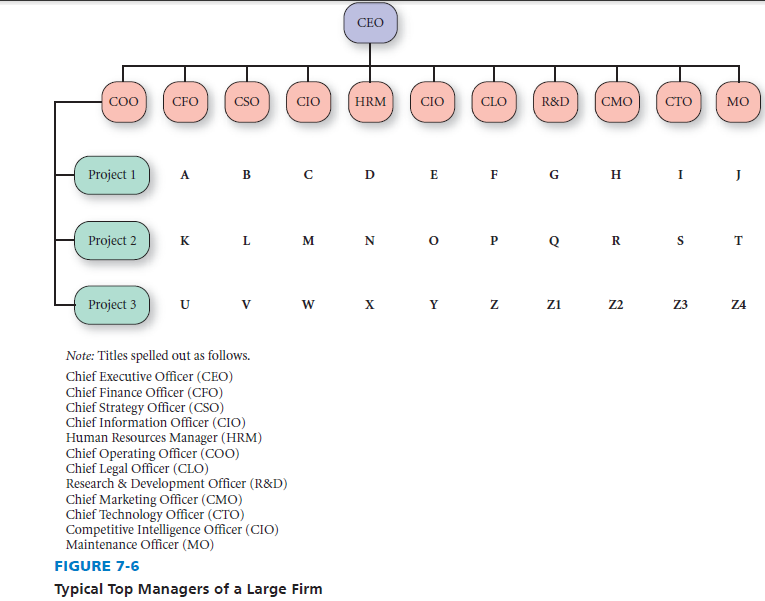 Directly below the CEO, it is best to have a COO (chief operating officer) with any division presidents reporting directly to the COO. On the same level as the COO and also reporting to the CEO, draw in your functional business executives, such as a CFO (chief financial officer), VP of human resources, a CSO (chief strategy officer), a CIO (chief information officer), a CMO (chief marketing officer), a VP of R&D, a VP of legal affairs, an investment relations officer, maintenance officer, and so on. Note in Figure 7-6 that these positions are labeled and placed appropriately in a matrix structure, which, as shown, generally include project managers rather than division presidents reporting to a Coo. However, note in Academic Research Capsule 7-1 the Coo position is losing favor in North America.