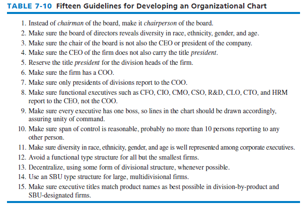 If a firm is large with numerous divisions, an SBU type of structure would be more appropriate to reduce the span of control reporting to the Coo. one never knows for sure if a proposed or actual structure is indeed most effective for a particular firm. Declining financial performance signals a need for altering the structure. Some important guidelines to follow in devising organizational charts for companies are provided in table 7-10.
