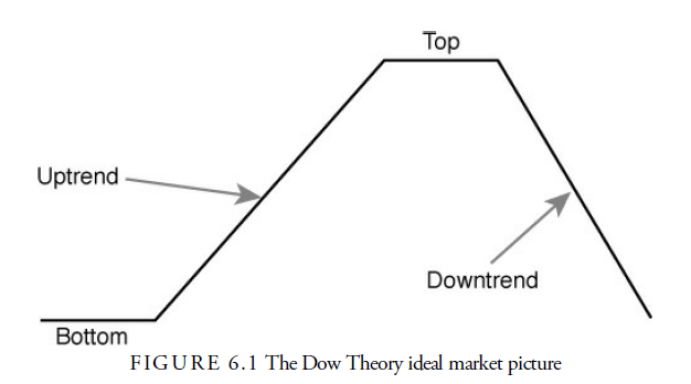 One of the theorems of Dow Theory is that the ideal market picture consists of an uptrend, top, downtrend, and bottom, interspersed with retracements and consolidations. Figure 6.1 shows what this ideal market picture would look like. This market picture, of course, is never seen in its ideal form. Consider Hamilton’s quote, “A normal market is the kind that never really happens” (May 4, 1911, in Rhea, 1932; pg. 154). The purpose of the ideal market picture is to provide a generalized model of the stock market’s price behavior over time. It is simple and resembles a harmonic without a constant period or amplitude.