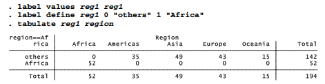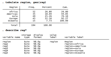 Categorical variables can become predictors in a regression when they are expressed as one or more {0,1} dichotomies called dummy variables. For example, we have already seen large regional differences in life expectancies (Figure 7.1). The categorical variable region takes values from 1 (Africa) to 5 (Oceania) which can be re-expressed as a set of five {0,1} dummy variables. The tabulate command offers an automatic way to do this, generating one dummy variable for each category of the tabulated variable when we include a gen (generate) option. In the example below the resulting dummy variables are named regl through reg5. regl equals 1 for African nations and 0 for others; reg2 equals 1 for the Americas and 0 for others; and so forth.