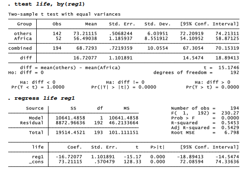 The t test confirms that the 16.72-year difference between means for Africa (56.49) and other regions (73.21) is statistically significant (t = 15.17, p = .000). We get exactly the same result from the dummy variable regression (t = -15.17, p = .000), where the coefficient regl (b1 = -16.72) likewise indicates that mean life expectancy is 16.72 years lower in Africa than in other regions (b0 = 73.21).