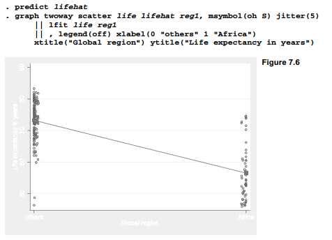 Figure 7.6 graphs this dummy variable regression. All the data points line up along two vertical bands at regl = 1 (Africa) and regl = 0 (elsewhere). To spread the points out visually this graph example employs a jitter(5) option, which adds a small amount of spherical random noise to the location of each point, so they do not all plot on top of each other. jitter() does not affect the regression line, which simply connects the mean of life when regl = 0 (73.21) with