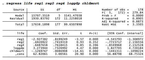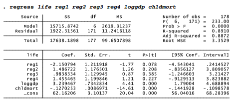 Next, dropping reg4 and finally reg2 results in a reduced model that still explains 89% of the variance in life expectancy (R2a = .8879) but with just three predictors.