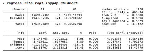 None of the regional dummy variables have significant effects, when we include them all and control for loggdp and chldmort. The nonsignificant coefficients suggests that a simpler model might fit just as well, and give a clearer picture of those effects that really do matter. The first step toward a reduced model involves dropping reg3, the weakest of these predictors. The result below fits just as well (R2a = .8873) and yields more precise estimates (lower standard errors) of other region effects. The coefficient on regl now appears significant.