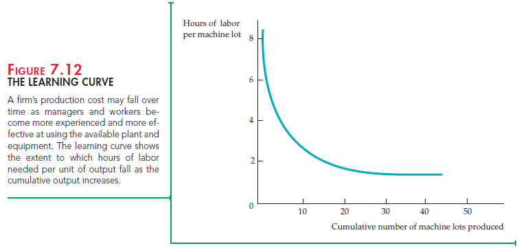Figure 7.12 shows a learning curve for the production of machine tools. The horizontal axis measures the cumulative number of lots of machine tools (groups of approximately 40) that the firm has produced. The vertical axis shows the number of hours of labor needed to produce each lot. Labor input per unit of output directly affects the production cost because the fewer the hours of labor needed, the lower the marginal and average cost of production.