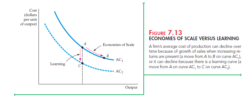 Figure 7.13 shows this phenomenon. ACX represents the long-run average cost of production of a firm that enjoys economies of scale in production. Thus the increase in the rate of output from A to B along AC1 leads to lower cost due to economies of scale. However, the move from A on AC1 to C on AC2 leads to lower cost due to learning, which shifts the average cost curve downward.