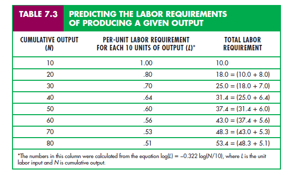 The learning curve is crucial for a firm that wants to predict the cost of producing a new product. Suppose, for example, that a firm producing machine tools knows that its labor requirement per machine for the first 10 machines is 1.0, the minimum labor requirement A is equal to zero, and b is approximately equal to 0.32. Table 7.3 calculates the total labor requirement for producing 80 machines.