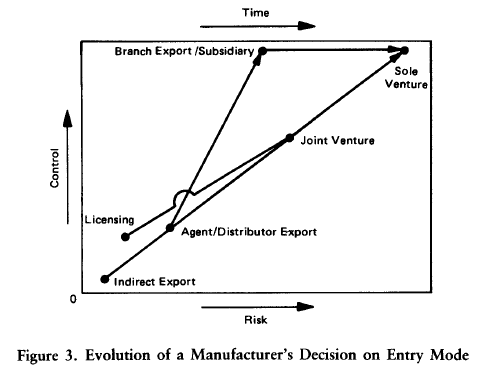 The evolution of a manufacturing firm’s entry mode decisions is depicted in Figure 3. Because of constraints imposed by size, some companies may not evolve beyond branch/subsidiary export, while other companies move o>n to joint and sole ventures in local production. Since the export mode is not available to them, service companies will follow a different evolutionary path, but the direction will also be toward greater management control (and greater risk).