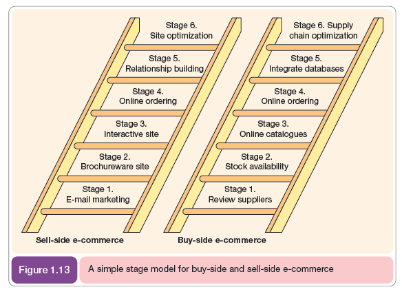 Assessment of an organization’s existing e-business capabilities is a starting point for the future development of their e-business strategy. We will see in Chapter 5 how different forms of stage models can be used to assess e-business capability. An example of a basic stage model reviewing capabilities for sell-side and buy-side e-commerce is shown in Figure 1.13. This shows how companies will introduce more complex technologies and extend the range of processes which are e-business-enabled. More detailed explanation and coverage of stage models is given in Chapter 5.