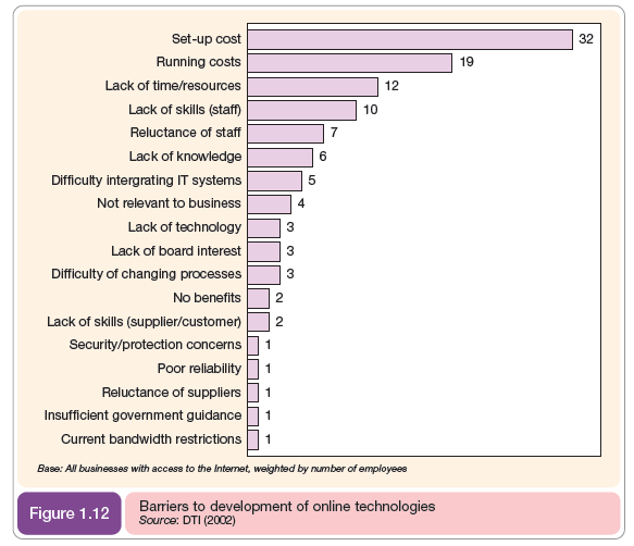 A DTI (2002) study evaluated some of the barriers to B2B e-commerce (Figure 1.12) which remain valid today. You can see that reasons of cost were the most important factors. This suggests the importance of managers assessing e-business to develop a cost-benefit analysis that considers both the initial investment costs and the ongoing costs that form the total cost of ownership (TCO) against the value created from the tangible and intangible benefits. The difficulties in implementation which we will review later in this book such as the lack of the right resources or difficulty in integrating systems are also indicated by the figure.