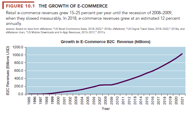 E-commerce began in 1995 when one of the first Internet portals, Netscape.com, accepted the first ads from major corporations and popularized the idea that the web could be used as a new medium for advertising and sales. No one envisioned at the time what would turn out to be an exponential growth curve for e-commerce retail sales, which doubled and tripled in the early years. E-commerce grew at double-digit rates until the recession of 2008-2009, when growth slowed to a crawl and revenues flattened (see Figure 10.1), which is not bad considering that traditional retail sales were shrinking by 5 percent annually. Since then, offline retail sales have increased only a few percentage points a year, whereas online e-commerce has been a stellar success.