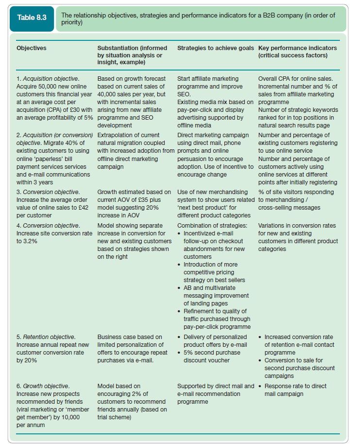 Strategies are agreed to be most effective when they support specific business objectives. A useful technique to help align strategies and objectives is to present them together in a table together with the insight developed from situation analysis which may have informed the strategy. Table 8.3 gives an example which also shows the links between strategies of customer acquisition, conversion and retention and the tactics used to fulfil them such as e-mail marketing and search engine marketing which we discuss in Chapter 9.