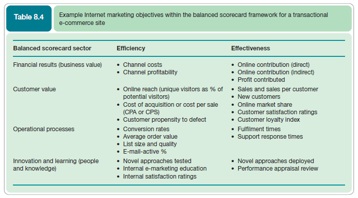 We also discussed the importance of SMART e-business objectives in Chapter 5 and gave an example of key measures used by e-business Arena Flowers to guage their performance. We also noted the value of using metrics which combined efficiency and effectiveness and could be applied in the context of the balanced scorecard. Table 8.4 presents detailed e-marketing metrics in this way.