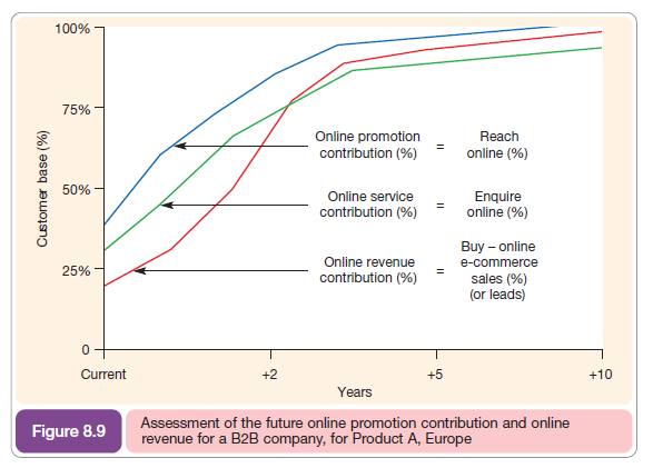 In Chapter 5, we also mentioned the importance of defining the online revenue contribution as a target to improve performance. Figure 8.9 gives an example combining the online revenue contribution and the online promotion contribution as a forecast based on marketing research of demand analysis and competitor analysis. Complete Case Study 8.1 to review how easyJet achieved an online revenue contribution of over 50 per cent.
