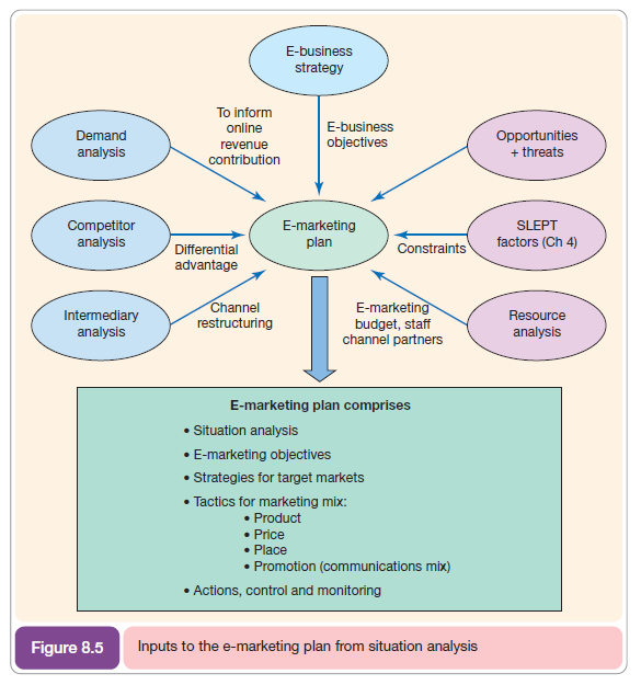 The aim of situation analysis is to understand the current and future environment in which the company operates in order that the strategic objectives are realistic in light of what is happening in the marketplace. Figure 8.5 shows the inputs from situation analysis that inform the e-marketing plan. These mainly refer to a company’s external environment.