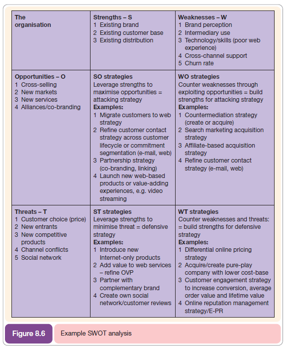 In Chapter 5 we introduced the use of a SWOT analysis for an organizations’ digital channels. The SWOT can be used to summarize the range of analyses covered in this section. Figure 8.6 gives an example of a typical Internet SWOT.