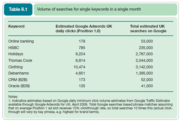 Savvy e-marketers use tools provided by search engine services such as Google to evaluate the demand for their products or services based on the volume of different search terms typed in by search engine users Table 8.1 shows the volume of searches for these generic, broad keywords. The numbers in the table are huge in any country, but most users also narrow their searches using phrases like ‘free online banking, ‘cuba holidays’ and ‘ski jackets’. This enables online suppliers to target their messages to consumers looking for these products in the search engines through advertising services such as Google and Overture (Yahoo! Search Marketing).