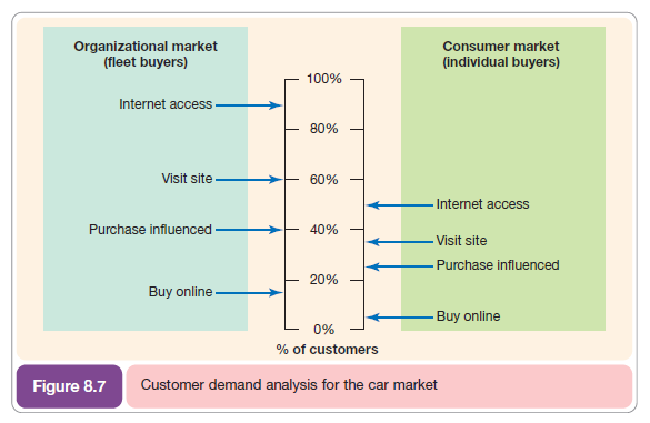 Now refer to Activity 8.1 where this analysis is performed for the car market. This picture will vary according to different target markets, so the analysis will need to be performed for each of these. For example, customers wishing to buy ‘luxury cars’ may have web access and a higher propensity to buy than those for small cars.
