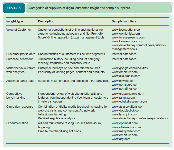 A summary of the categories of different sources of customer insight that an organization can tap into and their applications is shown in Table 8.2. The challenge within organizations seems to be selecting which paid-for and free services to select and then ensure sufficient time is spent reviewing and actioning the data to create value-adding insights. My experience shows that often data are only used by the digital team and not utilized more widely since in large organizations, staff are unaware of the existence of the data or service provider supplying it. There is also the significant issue of privacy; organizations need to be transparent about how they collect and use these data and give customers choice as discussed in Chapter 4.