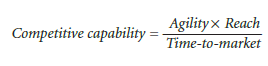 ‘Agility’ refers to the speed at which a company is able to change strategic direction and respond to new customer demands. ‘Reach’ is the ability to connect to potential and existing customers, or to promote products and generate new business in new markets. ‘Time-to-market’ is the product lifecycle from concept through to revenue generation.