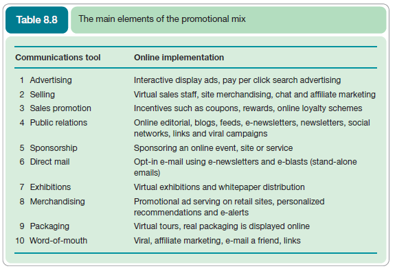 Specification of the Promotion is usually part of a communications strategy. This will include selection of target markets, positioning and integration of different communications tools. The Internet offers a new, additional marketing communications channel to inform customers of the benefits of a product and assist in the buying decision. The main elements of the promotional or communications mix and their online equivalents summarized by Chaffey and Smith (2008) are shown in Table 8.8: