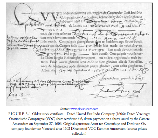 By 1585, public quotes of more than 339 items were reported as traded on the streets and in the coffee houses in Amsterdam (Boxer. 1965). Commodities had been traded there as early as 1530 (Stringham. 2003). The greatest of the early exchanges, the Amsterdam Exchange, called “The Beurs” or “Bourse,” was founded in 1608. The building housing the exchange was built in 1611 and was modeled after the Antwerp Bourse of 1531 (Munro, 2005). This exchange is famous for the “Tulip Bulb Mania” of 1621. By 1722, the Amsterdam Exchange provided trading space for more than 4,500 traders every day between noon and two o’clock (Ricard, 1722). Dealers, brokers, and the public traded and speculated on short sales, forwards, commodities, currencies, shares of ventures, and maritime insurance, as well as other financial instruments, such as notes, bonds, loans, and stocks. They traded grain, herring, spices, whale oil, and, of course, tulips (Kellenbenz, 1957, 1996). The principal stock traded was in the Dutch East India Company. (See Figure 3.1, which is an example of one of the oldest stock shares.) It seems likely that prices for these items were also recorded and analyzed.