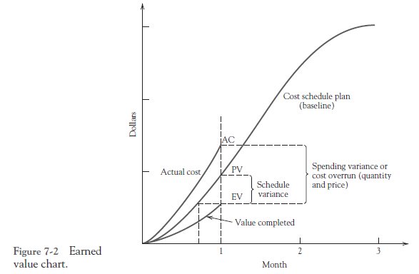 As the earned value of a project is calculated, a graph such as that shown in Figure 7-2 can be constructed. Given the limitations of the input data, such a figure provides a basis for evaluating cost, schedule, and performance to date. The earned value completed to date tells the manager whether progress is up to expectation, the “baseline” planned for this point in time. Any difference is called the “schedule variance,” which shows how much the project is ahead of or behind schedule. As seen in the figure, the value completed to date is less than the baseline estimate for this point in the project’s life and represents about a 10-day delay, resulting in a negative schedule variance (delay is negative). The actual cost, however, is considerably above the amount of value completed, resulting again in a negative (bad) “spending variance,” and even exceeds the baseline cost for this point. Thus, this figure represents a difficult situation—a project significantly behind schedule and considerably over budget at this time in the project’s life.