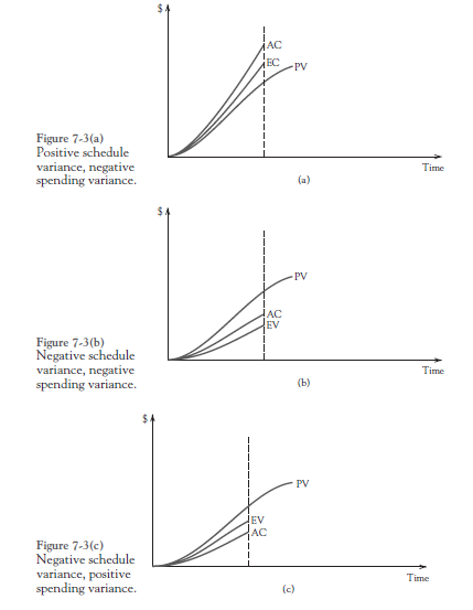 The variances on the earned value chart are calculated based on two simple rules:* (1) A negative variance is “bad,” and a positive variance is “good”; and (2) the spending and schedule variances are calculated as the earned value minus some other measure. Specifically, the cost or spending variance is the earned value (EV) less the actual cost (AC) of the work performed. The schedule variance is the EV less the planned cost (PV) of the work budgeted and scheduled to have been performed to date as determined from the baseline plan. All measures are made as of the same date. For a variety of examples of different possible scenarios, see Figures 7-3(a), (b), and (c).