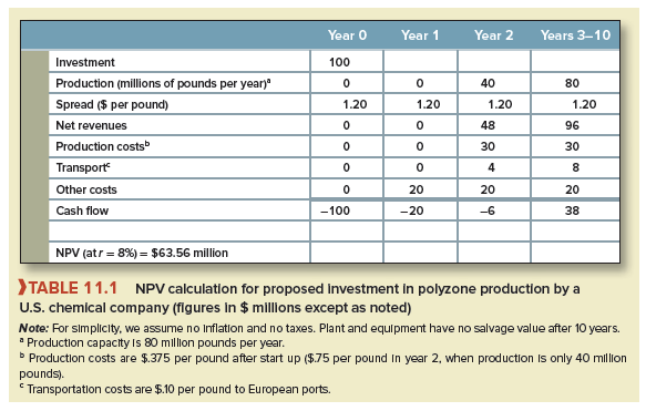 Then doubt began to creep in. Notice the outlay for transportation costs. Some of the project’s raw materials were commodity chemicals, largely imported from Europe, and much of the polyzone production would be exported back to Europe. Moreover, the U.S. company had no long-run technological edge over potential European competitors. It had a head start perhaps, but was that really enough to generate a positive NPV?