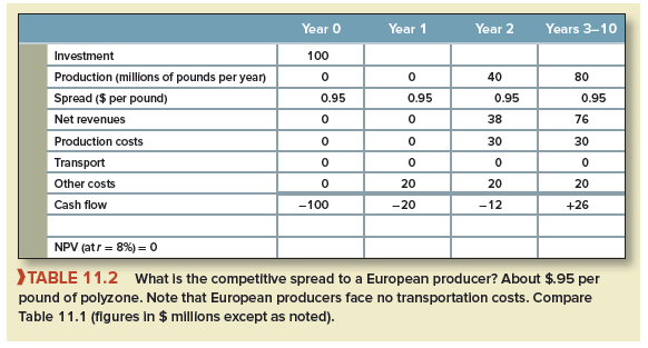 Notice the importance of the price spread between raw materials and finished product. The analysis in Table 11.1 forecasted the spread at a constant $1.20 per pound of polyzone for 10 years. That had to be wrong: European producers, who did not face the U.S. company’s transportation costs, would see an even larger NPV and expand capacity. Increased competition would almost surely squeeze the spread. The U.S. company decided to calculate the competitive spread—the spread at which a European competitor would see polyzone capacity as zero NPV. Table 11.2 shows management’s analysis. The resulting spread of about $.95 per pound was the best long-run forecast for the polyzone market, other things constant of course.