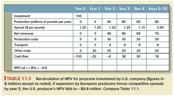 How much of a head start did the U.S. producer have? How long before competitors forced the spread down to $.95? Management’s best guess was five years. It prepared Table 11.3, which is identical to Table 11.1 except for the forecasted spread, which would shrink to $.95 by the start of year 5. Now the NPV was negative.