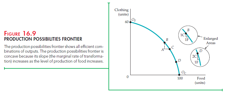 MARGINAL RATE OF TRANSFORMATION The production possibilities frontier is concave (bowed out)—i.e., its slope increases in magnitude as more food is produced. To describe this, we define the marginal rate of transformation of food for clothing (MRT) as the magnitude of the slope of the frontier at each point. The MRT measures how much clothing must be given up to produce one additional unit of food. For example, the enlarged areas of Figure 16.9 show that at B on the frontier, the MRT is 1 because 1 unit of clothing must be given up to obtain 1 additional unit of food. At D, however, the MRT is 2 because 2 units of clothing must be given up to obtain 1 more unit of food.