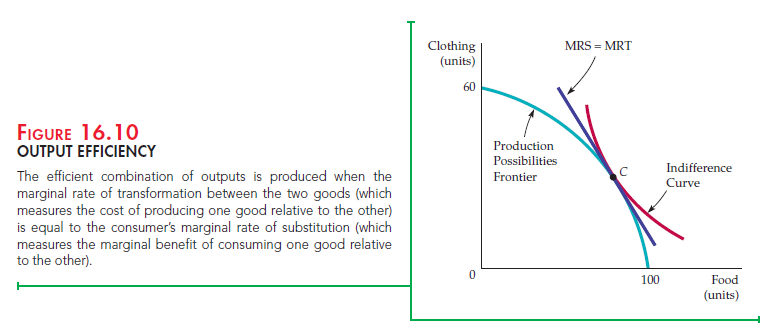 Figure 16.10 shows this important output efficiency condition graphically. Here, we have superimposed one consumer’s indifference curve on the production possibilities frontier from Figure 16.9. Note that C is the only point on the production possibilities frontier that maximizes the consumer’s satisfaction. Although all points on the production frontier are technically efficient, not all involve the most efficient production of goods from the consumer’s perspective. At the point of tangency of the indifference curve and the production frontier, the MRS (the slope of the indifference curve) and the MRT (the slope of the production frontier) are equal.