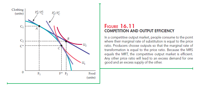 Figure 16.11 shows that efficient competitive output markets are achieved when production and consumption choices are separated. Suppose the market generates a price ratio of P’F/P’c. If producers are using inputs efficiently, they will produce food and clothing at A, where the price ratio is equal to the MRT, the slope of the production possibilities frontier. When faced with this budget constraint, however, consumers would like to consume at B, where they maximize their satisfaction at the higher indifference curve U2. However, at the price ratio Pf/Pc, producers will not produce the combination of food and clothing at B. Because the producer wants to produce F1 units of food, while consumers want to buy F2, there will be an excess demand for food. Correspondingly, because consumers wish to buy C2 units of clothing while producers wish to sell Cv there will be an excess supply of clothing. Prices in the market will then adjust: The price of food will rise and that of clothing will fall. As price ratio Pf/Pc increases, the price line will move along the production frontier.