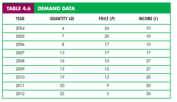 The price and quantity data from Table 4.6 are graphed in Figure 4.19. If we believe that price alone determines demand, it would be plausible to describe the demand for the product by drawing a straight line (or other appropriate curve), Q = a – bP, which “fit” the points as shown by demand curve D. (The “least- squares” method of curve-fitting is described in the appendix to the book.)