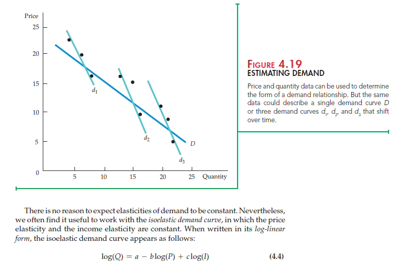where log ( ) is the logarithmic function and a, b, and c are the constants in the demand equation. The appeal of the log-linear demand relationship is that the slope of the line -b is the price elasticity of demand and the constant c is the income elasticity.[1] Using the data in Table 4.5, for example, we obtained the regression line