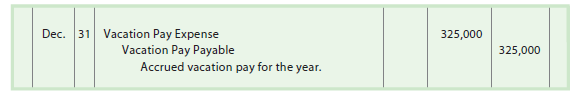 To illustrate, assume that employees earn one day of vacation for each month worked. The estimated vacation pay for the year ending December 31 is $325,000. The adjusting entry for the accrued vacation is shown below.