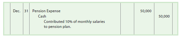 In most cases, the employer matches some portion of the employee’s contribution. The employer’s cost is debited to Pension Expense. To illustrate, assume that Heaven Scent Perfumes Company contributes 10% of employee monthly salaries to an employee 401k plan. Assuming $500,000 of monthly salaries, the journal entry to record the monthly contribution is shown below.