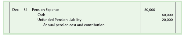 To illustrate, assume that the defined benefit plan of Hinkle Co. requires an annual pension cost of $80,000. This annual contribution is based on estimates of Hinkle’s future pension liabilities. On December 31, Hinkle Co. pays $60,000 to the pension fund. The entry to record the payment and the unfunded liability is shown on the next page.