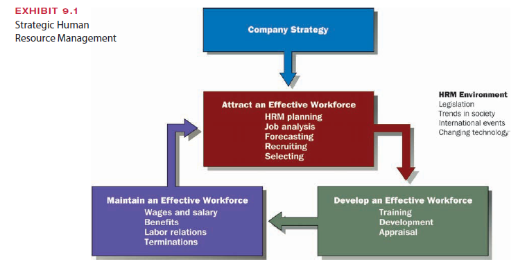 The three broad HRM activities outlined in Exhibit 9.1 are to attract an effective work- force, develop the workforce to its potential, and maintain the workforce over the long term.14 Achieving these goals requires skills in planning, recruiting, training, performance appraisal, wage and salary administration, benefit programs, and even termination. Each of the activities in Exhibit 9.1 will be discussed in this chapter.