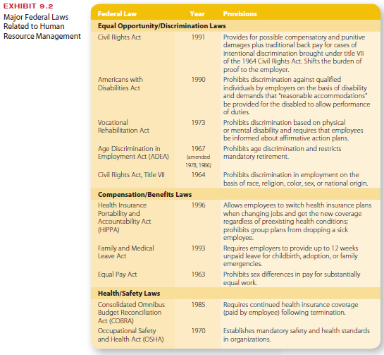 Exhibit 9.2 also lists the major federal laws related to compensation and benefits and health and safety issues. The scope of HR legislation is increasing at federal, state, and municipal levels. The working rights and conditions of women, minorities, older employ- ees, and the disabled will likely receive increasing legislative attention in the future.