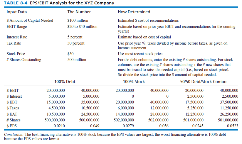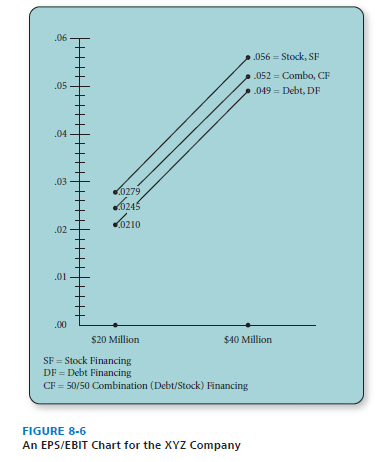 Perhaps the best way to explain EPS/EBIT analysis is by working through an example for the XYZ Company, as provided in Table 8-4. Note that 100 percent stock is the best financing alternative as indicated by the EPS values of 0.0279 and 0.056. An EPS/EBIT chart can be constructed to determine the breakeven point, where one financing alternative becomes more attractive than another. Figure 8-4 reveals that issuing common stock is the best financing alternative for the XYZ Company. As noted in Figure 8-6, the top row (EBIT) on the x-axis is graphed with the bottom row (EPS) on the y-axis, and the highest plotted line reveals the best method.