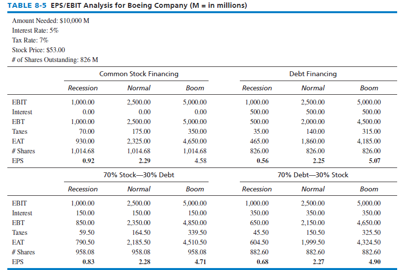 In Table 8-5, note that Boeing should use stock to raise capital in a recession (see 0.92) or in normal (see 2.29) economic conditions but should use debt financing under boom conditions (see 5.07). Let us calculate here the “# Shares” figure of 1,014.68 given under Boeing’s stock alternative. Divide $10,000 M funds needed by the stock price of $53 = 188.68 M new shares to be issued + the 826 M shares outstanding already = 1014.68 M shares under the stock scenario. Along the final row, EPS is the number of shares outstanding divided by EAT in all columns.